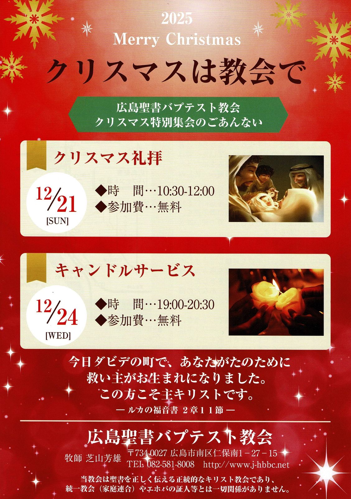 2025年クリスマス集会 クリスマスは教会で過ごしてみませんか。 12月21日(日)午前10時30分から午後12時までクリスマス特別礼拝を開きます。 この礼拝では本当のクリスマスを味わうことができます。美しいクリスマスソングやクリスマスを迎える喜びを聞くことができます。 12月24日(水)午後7時から8時30分までクリスマスキャンドルサービスを開きます。 静かな夜にローソクの灯火の中イエス・キリストの誕生を覚えてクリスマスソングを歌います。 そして、聖書からキリストの誕生の出来事を聞きます。心からクリスマスの喜ぶことが出来ます。 どちらの集まりも誰でもご参加いただけます。お気軽にお越しください。 集会参加は無料です。 ↓詳しくはこちらをクリックしてください 削除 投稿者:広島聖書バプテスト教会