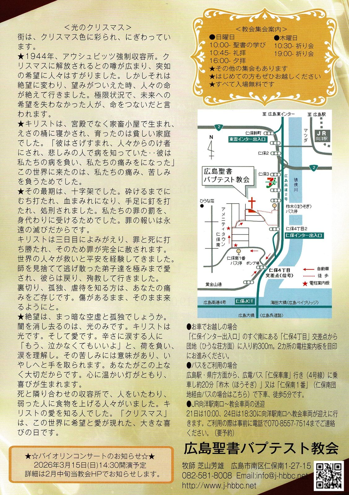 今年も辻井淳さんを招いてのバイオリンコンサートを開催いたします。 ぜひ素敵なひとときをお楽しみください。 ご来場をお待ちしております。 尚、ご来場の際には公共交通機関をご利用ください。駐車場がありません。 ■日時:2024年3月17日(日) 開場PM2:00 開演PM2:30 ■会場:広島聖書バプテスト教会 会堂 ↓詳しくはこちらをクリックしてください 演奏曲目 1.トゥリーナ:ナヴァラを讃えて 2.コミタス:鶴 3.ファリャ:スペイン民謡組曲より 4.ラフマニノフ:2つの小品より 5.スコリク:メロディ 6.ラター:エルサレムの嘆き 7.トルドラ:5月の祈り 8.レハール:セレナーデ 9.バーレイ:夏の牧歌 10.バーレイ:曲がりくねった流れ(自然の声) 11.バーバー:カンツォーネ 12.スコット:熟れたサクランボ 13.パガニーニ:カンタービレとワルツ 14.マネン:イベリア舞曲第一番 15.ベンハイム:ユダヤの子守唄 削除 投稿者:広島聖書バプテスト教会